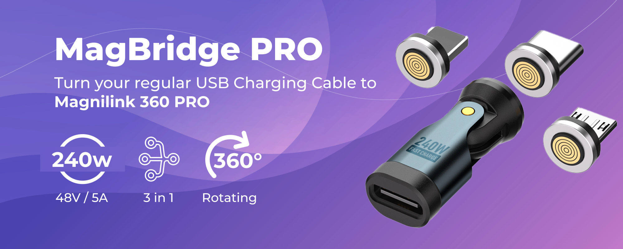 Transform your charging experience with the MagBridge PRO, the ultimate adapter for versatility and convenience. This innovative adapter converts any regular USB-C cable into a Magnilink 360 PRO Magnetic Cable, seamlessly integrating with your Magnilink ecosystem. Designed with the same 360° rotating magnetic head and supporting up to 240W charging speed, the MagBridge PRO ensures fast, reliable, and flexible charging for all your devices.