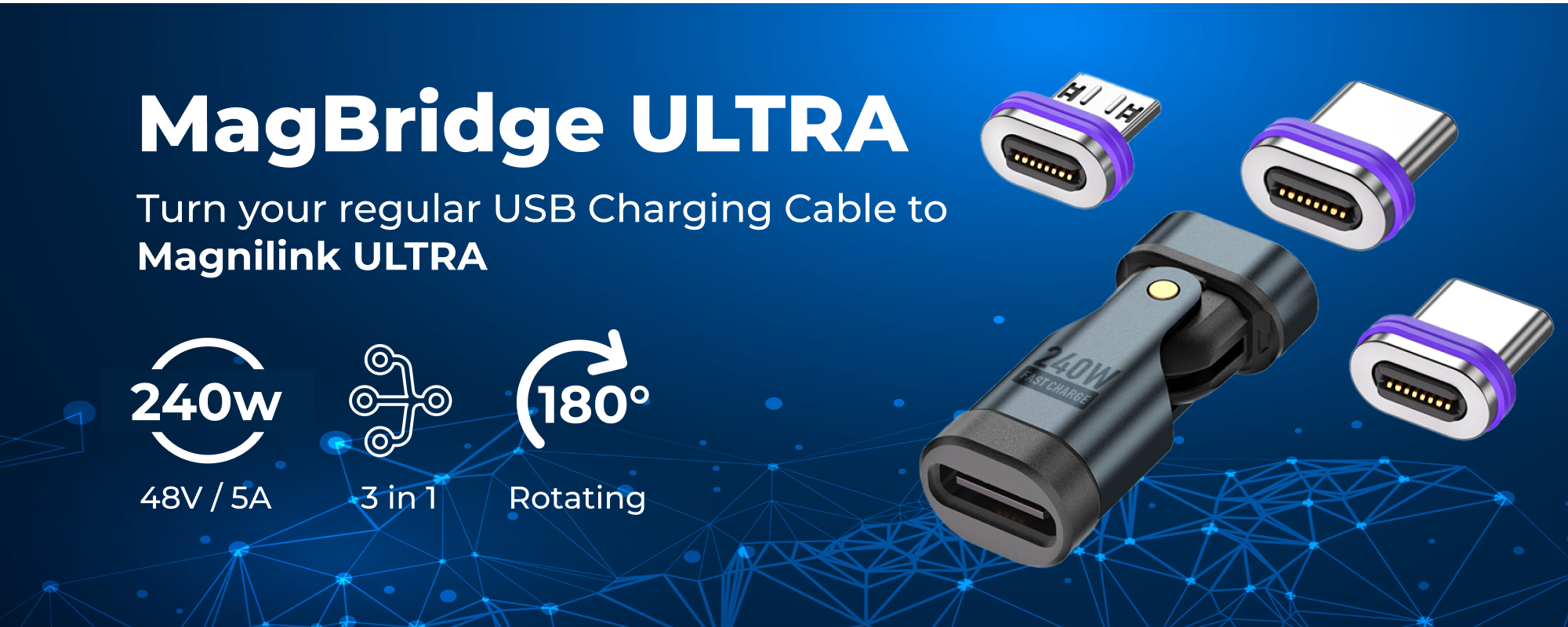 Transform your charging experience with the MagBridge ULTRA, the perfect adapter for Magnilink ULTRA magnetic connectors (16-pin). This innovative adapter turns any standard USB-C cable into a Magnilink ULTRA Magnetic Cable, providing unmatched convenience and versatility. With its slim, rectangular-shaped magnetic connector, the MagBridge ULTRA fits seamlessly with any phone case, while the pivotable head ensures smooth and flexible charging at any angle.