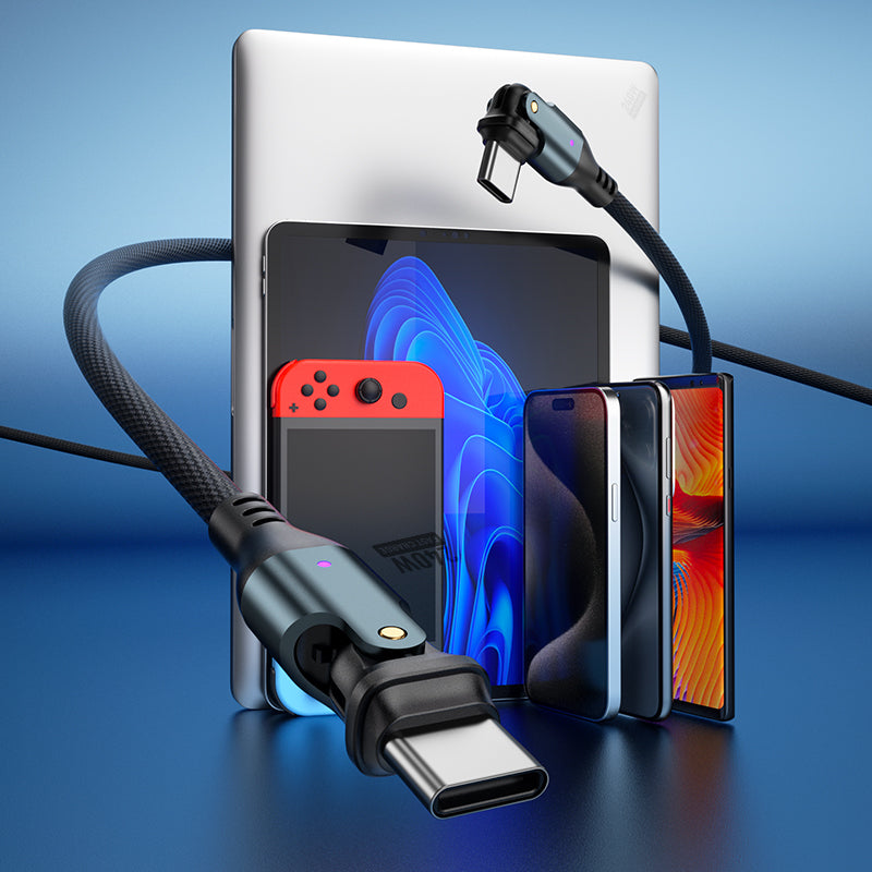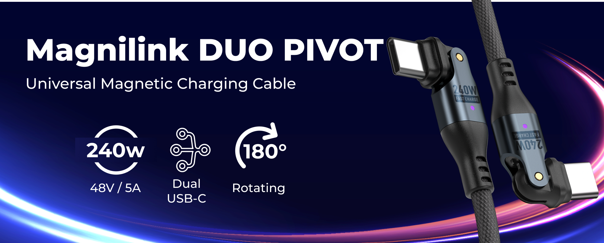 The Magnilink DUO PIVOT is not your average USB-C charging cable—it’s built for flexibility and power. Featuring a unique 180° pivotable head on both ends, this cable adapts effortlessly to your charging needs, providing convenience and reducing strain on your device’s ports. Designed for power users, the Magnilink DUO PIVOT supports up to 240W charging speed, making it ideal for high-power devices like laptops, gaming consoles, and smartphones.